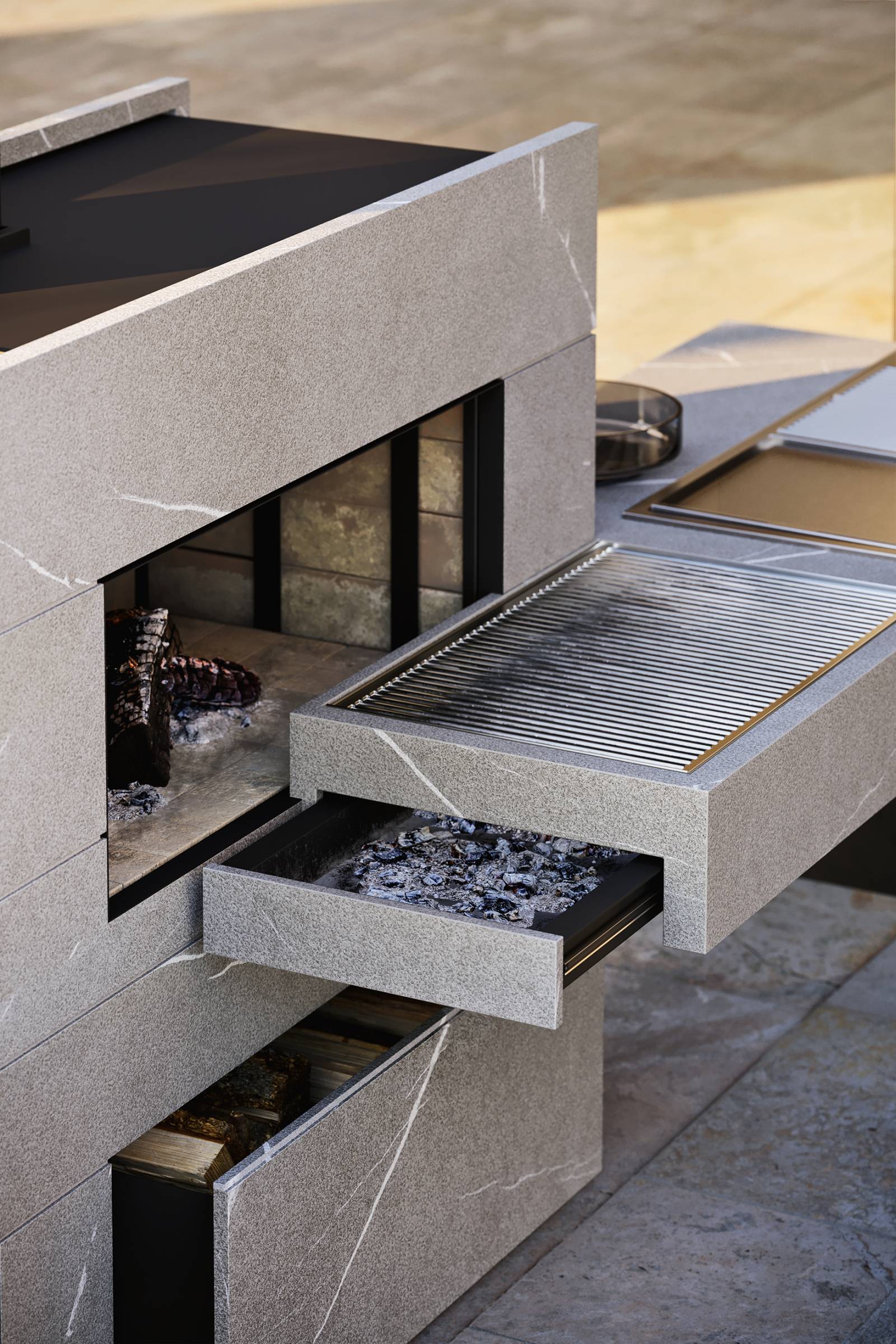 Le bloc cuisine dispose d’une cheminée avec un four à bois et un tiroir coulissant pour le bois. Le plan posé de droite comporte une grille en acier inox et un tiroir coulissant pour les braises. Le plan posé de gauche comprend une zone dédiée au lavage et un bac qui peut éventuellement être transformé en un pratique seau à glace.